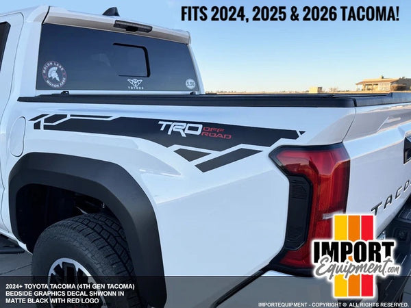 Item Description: TRD "4x4 Off Road" Graphics Kit for 2024 & 2025 Toyota Tacoma Please Note: THIS ITEM DOES NOT FIT THE 2016-2023 TOYOTA TACOMA Size: Cut to fit bed sides as shown in photos. Qty: 1 Kit (1 drivers bedside, 1 passengers bedside) Color Info: Please read the following very carefully: MAIN COLOR: This will be the main color for the kit (Black in the photos) LOGO COLOR: This will be the color of the "4x4 Off Road" lettering (Red in the photos). TRD LOGO will be cut out of the decal so anywhere you see the TRD logo it will be the paint color of your truck. Additional Info: This kit is NOT a genuine OEM product. This is our take on the very rare TRD PRO Graphics Kit. This item was created using a 2024 Toyota Tacoma Double Cab Short Bed, if your vehicle is a different year/style than the one used to create this sticker, please verify fitment prior to ordering. Detailed step by step installation instructions (including how to make your own application fluid) included with purchase. As always, we use premium vinyl with all our stickers to maximize the lifespan of the sticker.